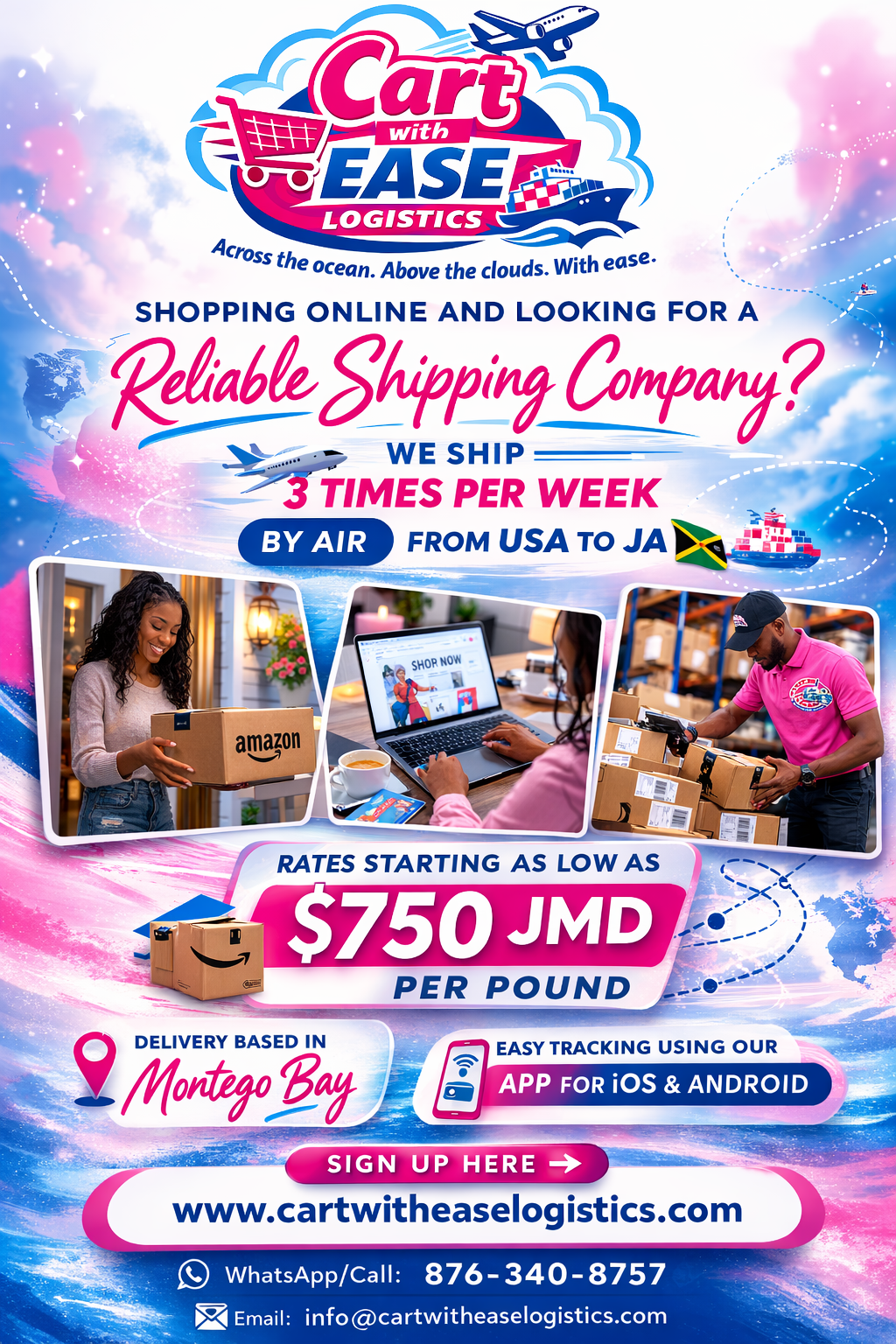 At Cart With Ease Logistics, we specialize in making international shopping simple, secure, and efficient. We provide our customers with a trusted U.S. shipping address and reliable air freight services from the United States to Jamaica. Our team is committed to ensuring that every package is handled with care, processed quickly, and delivered safely. We understand how important your purchases are, which is why we focus on transparency, timely updates, and exceptional customer service. Whether you're shopping for personal items or business supplies, Cart With Ease Logistics is dedicated to providing a seamless shipping experience — because with us, shipping is done the easy way.